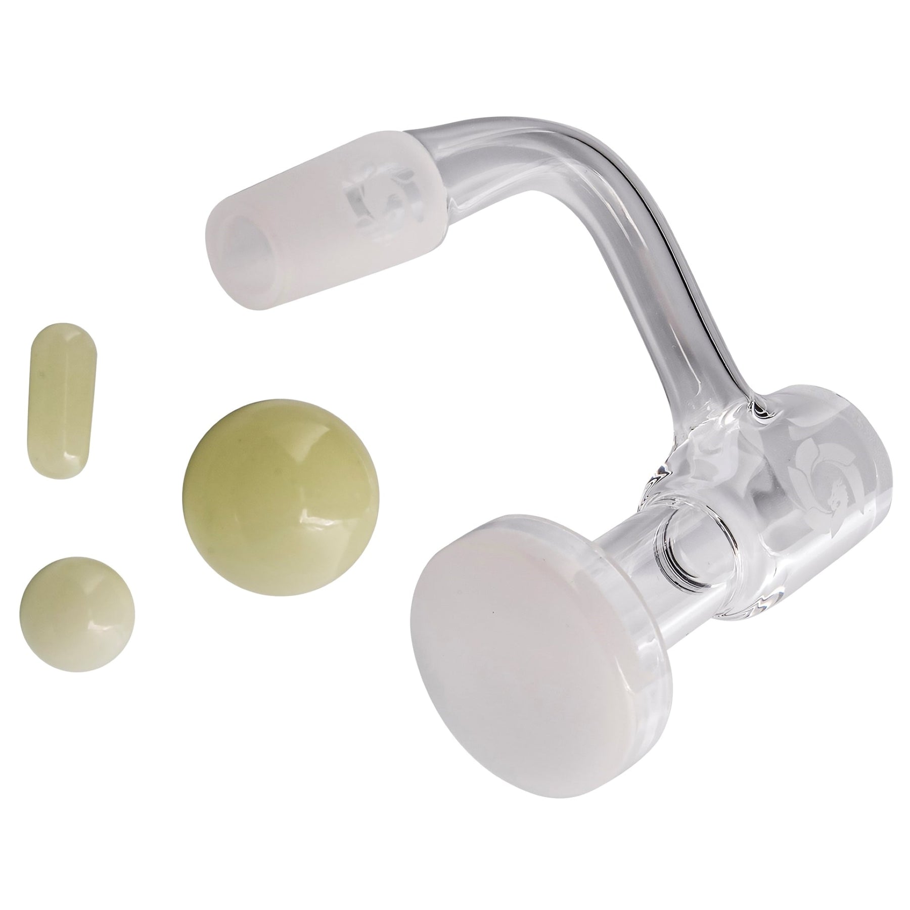 The Terp Vacuum Banger is one of the largest bangers from Glasshouse and is built to deliver thick and tasty dab rips. Unlike traditional bangers, the dabs should be dropped externally on the glass tube rather than inside the bucket. In addition to the banger, this set includes a UV capsule that goes inside the glass tube and a UV medium marble that sits inside the bucket that both work to disrupt airflow and evenly vaporize your concentrates. It also comes with a large UV marble that sits on top of the bucket section and acts as a carb cap for more control of airflow. This banger has a 14mm Male joint which fits a female joint and a 90-degree joint angle to pair with oil rigs that also have a 90-degree joint connection. The standard Terp Vacuum Banger comes in clear glass but if you are looking for a banger that holds heat a little longer the frosted version is recommended.