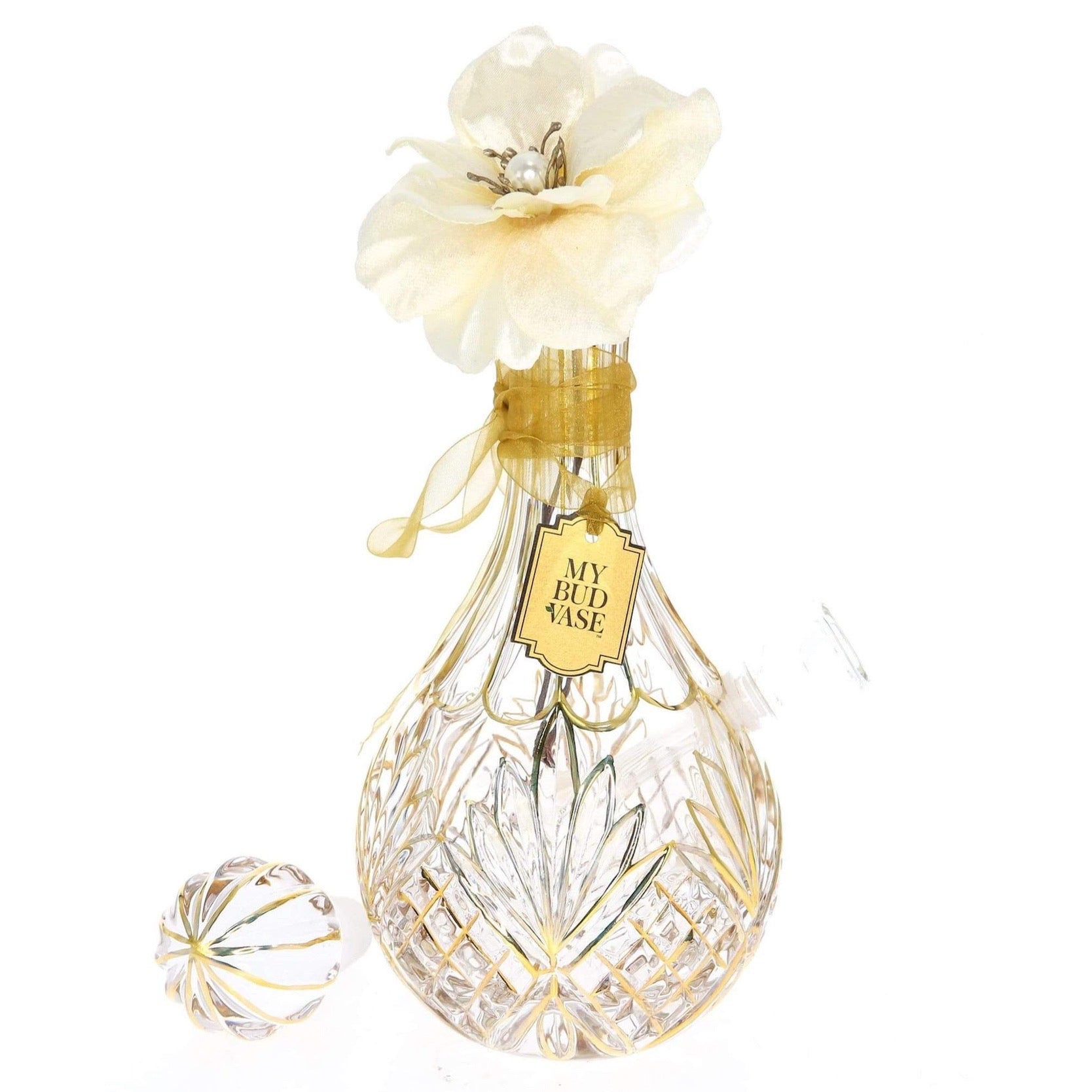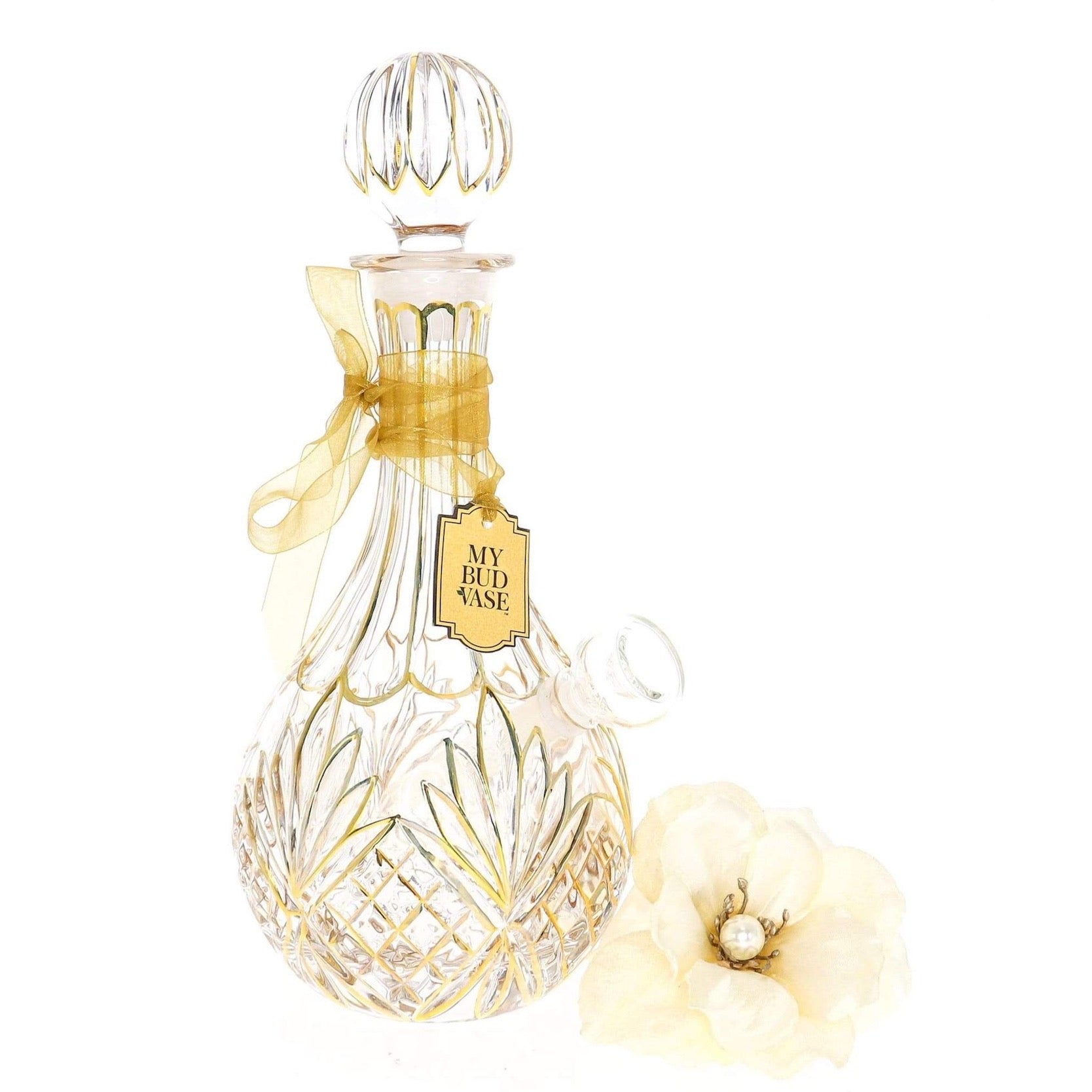 Meet Stardust, the only woman you'll ever need in your life. This lovely lady promises to leave a lasting impression and lives for entertaining. The My Bud Vase Stardust Water Pipe stands 12” inches tall and features a decanter-style body made of thick textured glass with hand-painted gold detailing. When using the matching glass stopper or the ivory pearl anemone flower poker tool inserted through the mouthpiece, this water pipe will easily blend into your everyday scenery. Well, it will at least try its best to blend in despite sporting a gorgeous aesthetic.
