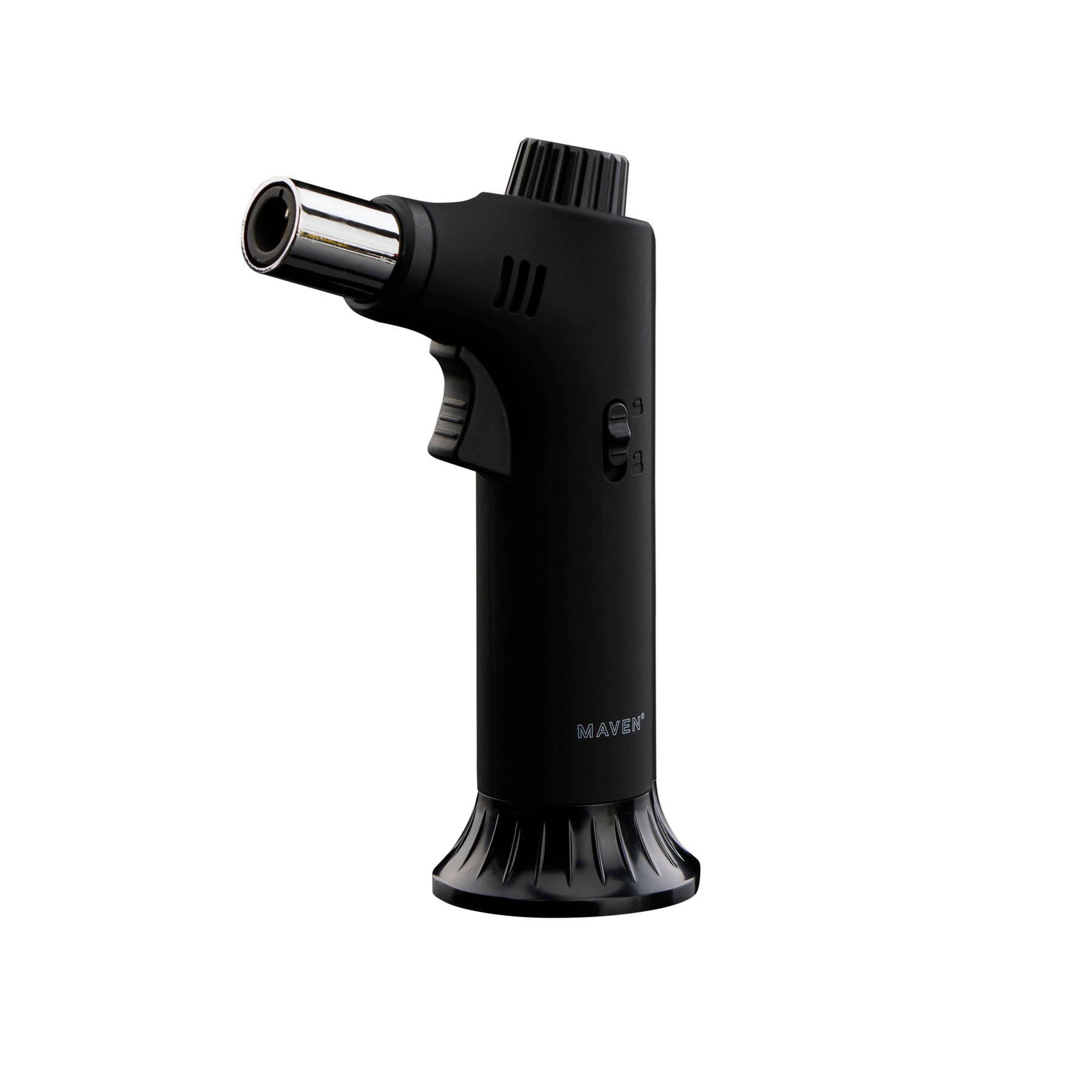 The Maven Pillar Dab Torch has a height of 7" inches and has a defined torch angle for precise lighting. It has a flame adjusting knob for easy adjustment and a strong built table base and ignition hold, allowing it to stand and light on its own. The torch features new sky blue and neon green colors, a single windproof jet flame, adjustable flame, safety lock/ignition hold, and is butane refillable.