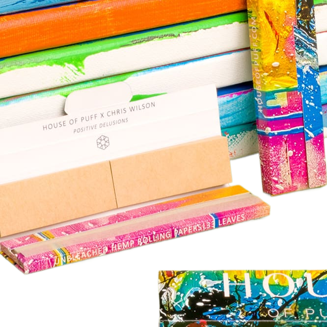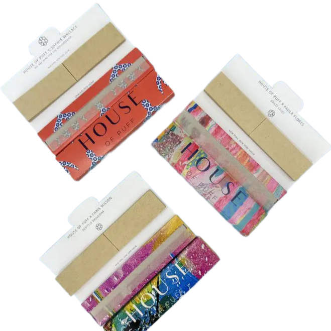 Discover the perfect smoking experience with House of Puff Rolling Papers. Crafted to perfection with all-natural hemp papers and slow-burning tips, these rolling papers and filter tips are unbleached and completely sustainable. With every pack sold, you not only support the artists but also contribute to non-profits of the artist's choosing. Each pack contains 33 leaves and the premium unbleached hemp papers provide a thin and slow-burning texture for a longer, satisfying puff.