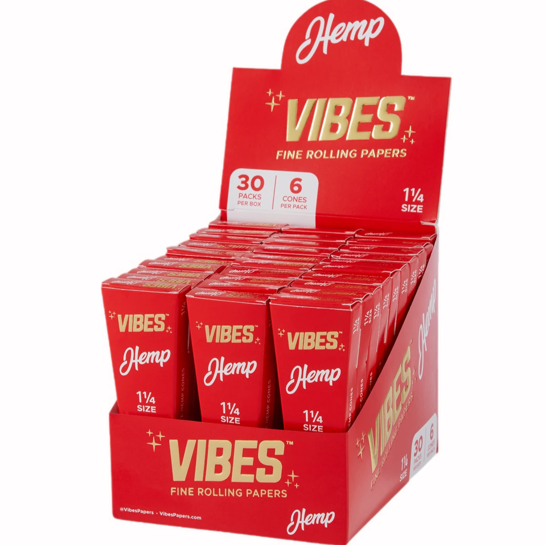 Ensure you always have an ample supply of Vibes Cones with the Vibes Cones Box - 1.25”. This box contains 30 coffins, with 6 cones in each coffin, giving you a total of 180 cones. Choose from Ultra Thin, Rice, or Hemp varieties, each designed for a slow and consistent burn. Vibes Rice Cones are perfect for those who prefer a longer session, thanks to the slow-burning rice paper and proprietary airflow design. For a comprehensive session, try the uber-thin Vibes Ultra Thin Cones, which allow for maximum smoke of your chosen material. The Vibes Hemp Cones provide a traditional hemp cone experience, with slow and even burning for full flavor enjoyment. Made with 100% organic hemp fibers.